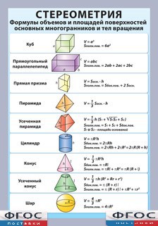 Таблица "Стереометрия. Формулы объемов и площадей поверхностей основных многогранников и тел вращения" (винил) - fgospostavki.ru - Балашиха