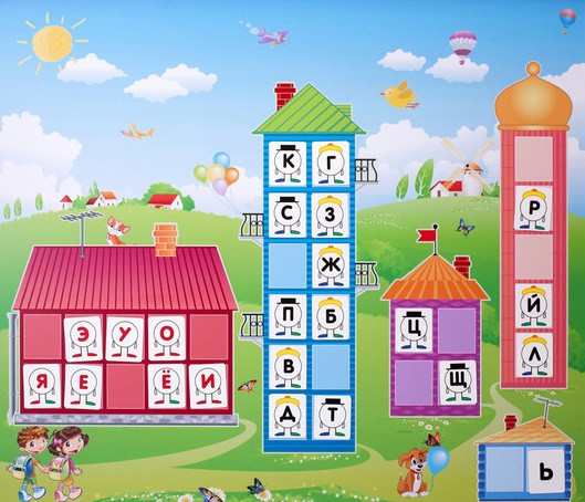 В комплекте с доской поставляются 33 магнитных карточки, причем звуки, изображенные на них одеты в шапочки и башмачки. Их разноцветный наряд  помогает ребятам разобраться в звуковом ряде русского алфавита.