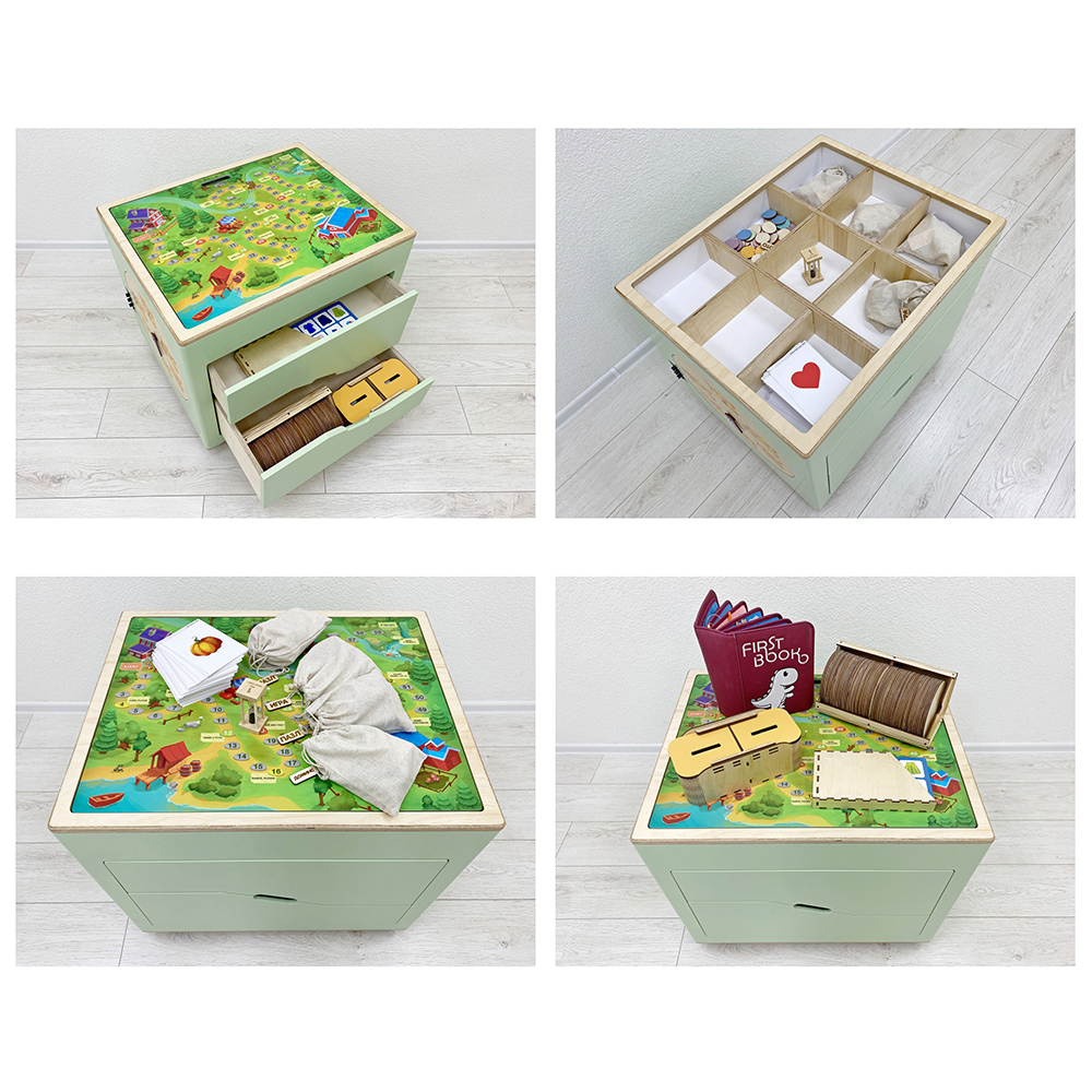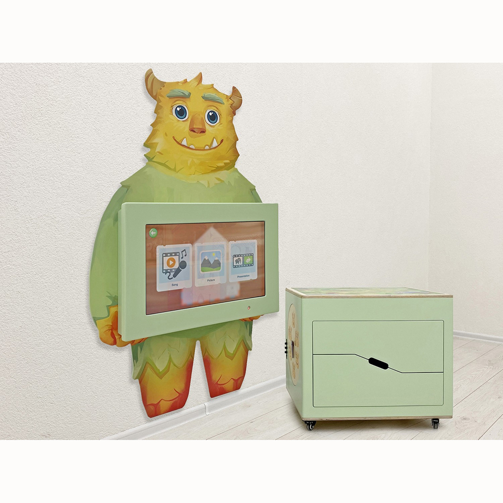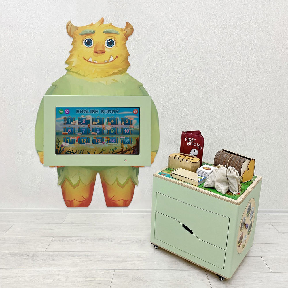 Интерактивную панель держит главный герой - добродушный монстр Бадди (от англ. ‘Buddy’ – приятель). Мобильный куб на колёсиках может передвигаться в любое место класса, где детям удобнее заниматься, и имеет два ящика с настольными играми и дидактическими карточками. По бокам он оформлен бизибордами на тему погоды и настроения, а сверху на крышке – красочная пошаговая игра-бродилка.