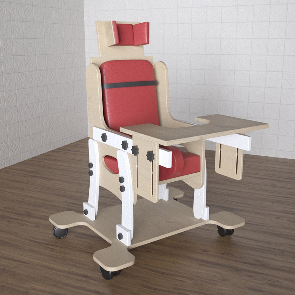 Разработан для детей с ДЦП и прочими нарушениями двигательного аппарата как адаптационный модуль. Оснащен фиксатором головы. Мобилен благодаря платформе с колесиками, однако может использоваться и без нее. Конструкция стула предполагает автономность – в комплекте уже есть небольшой столик, на котором можно разместить учебник, или использовать его в качестве обеденного. Столешницу можно отрегулировать до нужной высоты. Предназначен для оборудования кабинетов специалистов, занимающихся реабилитацией детей с ОВЗ, учебных помещений в центрах коррекции и реабилитации.