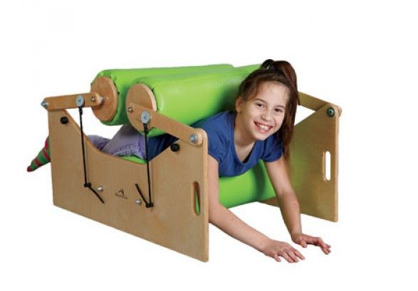 Данное устройство выполняет сразу 2 функции: обьятие ребенка и успокаивающее глубокое давление. Устройтво изготовлено из паралона,фанеры и резиновых шнуров . Давление на ребенка легко регулируется и может быть подобрано исходя из его физических данных, что позволяет выбрать подходящий уровень проприоцептивной обратной связи для каждого ребенка.