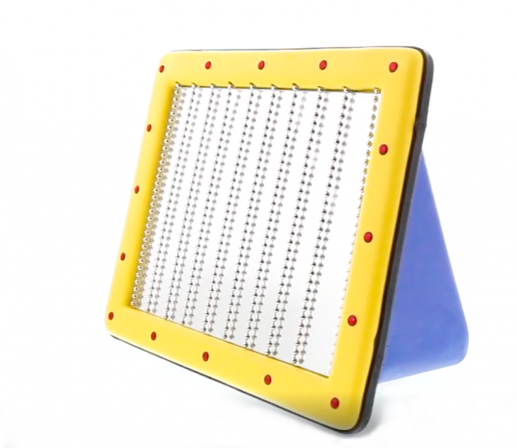 Зеркало-подставка было разработано для коррекционных и реабилитационных занятий с детьми с ограниченными возможностями здоровья. Помогает наладить коммуникацию, воздействуя на органы слуха, зрения и осязания. Представляет собой устройство в корпусе прямоугольной формы с огоньками по периметру рамы; основная поверхность зеркальная, поверх неё имеются цепочки, дотронувшись до которых можно услышать различные мелодии. Изготовлено из высококачественного ударопрочного пластика, имеет обтекаемые плавные формы без острых краёв и углов.