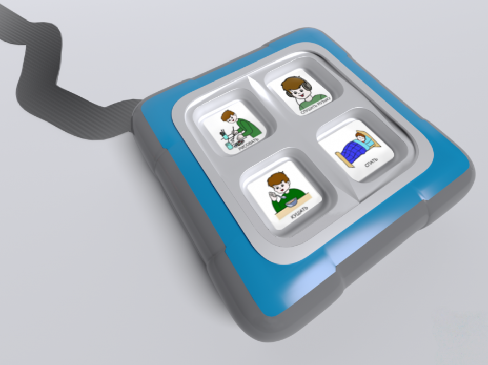 4-х кнопочный игровой коммуникатор №3 предназначен для комфортного общения с остальным миром детей, имеющих проблемы со слуховым, зрительным восприятием и коммуникацией (аутизм, ДЦП). Устройство позволяет наладить беседу со сверстниками и учителями, используя заранее записанные голосовые сообщения и изображения-подсказки. Представляет собой квадратный корпус небольшого размера, на котором размещены 4 кнопки с окошками, которые предназначены для сменных картинок с надписями. Изготовлено из высококачественного ударопрочного пластика, имеет обтекаемые плавные формы без острых краёв и углов.