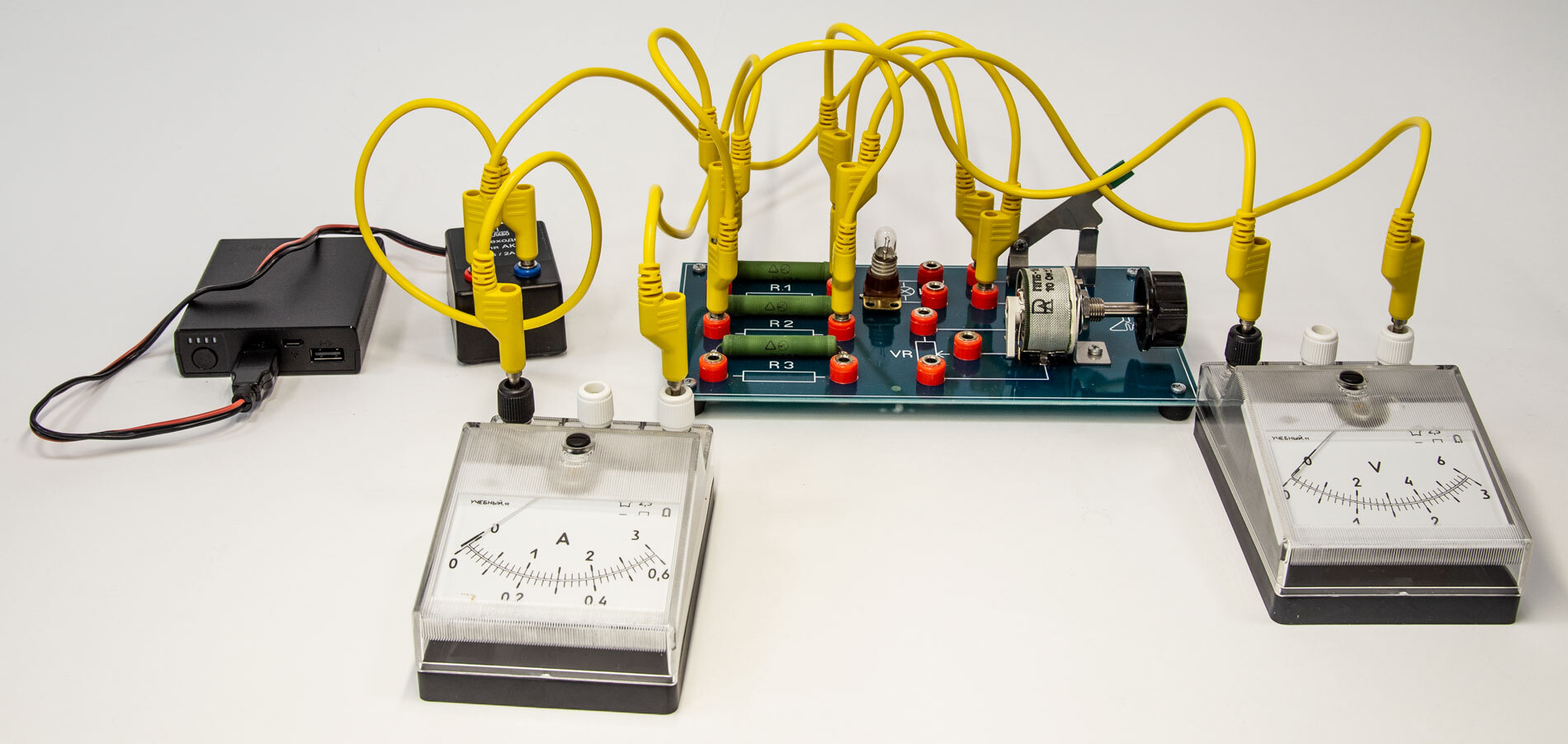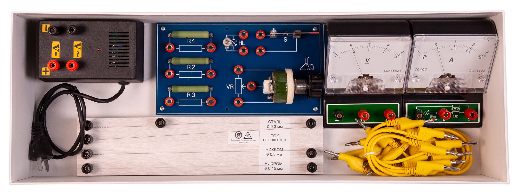 Комплект позволяет измерять сопротивление резистора, мощность и работу электрического тока, исследовать зависимость силы тока от напряжения, зависимость сопротивления от длины проводника, площади поперечного сечения и удельного сопротивления, а также проверять зависимость напряжения при последовательном соединении проводников и зависимость тока при параллельном соединении проводников.