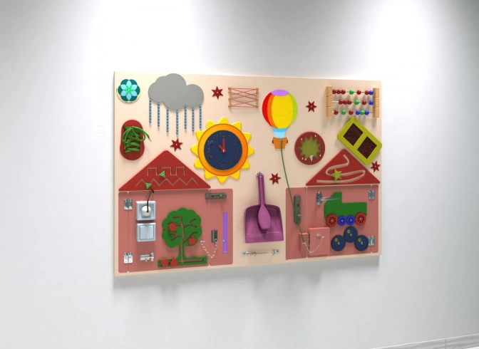 Настенная панель представленного образца выполнена из дерева, основание окрашено в нейтральный бежевый цвет, а развивающие детали и приспособления выделяются яркими акцентами.