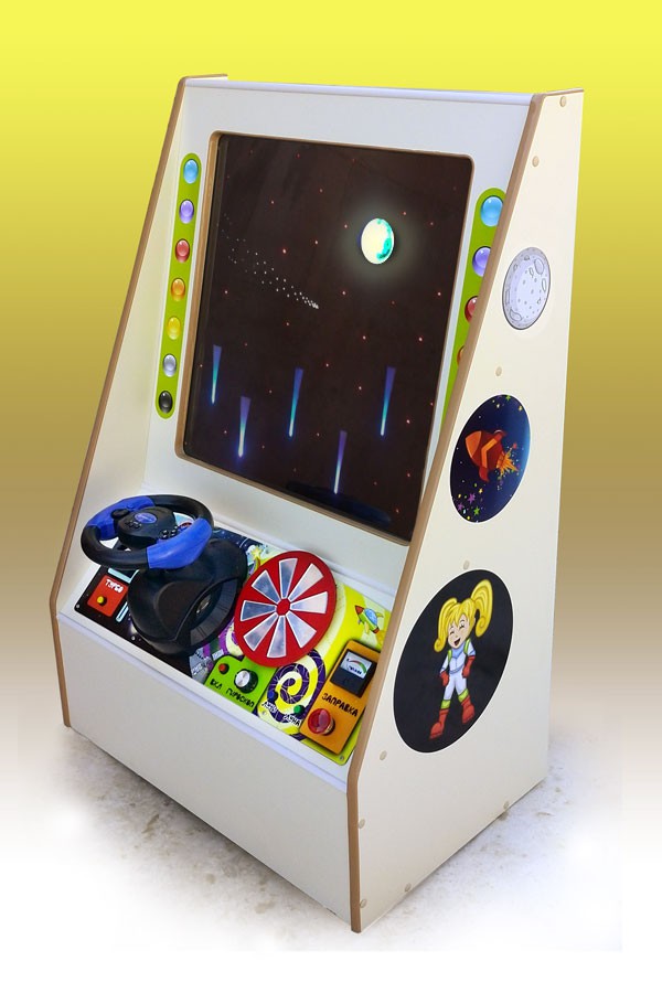 В верхней части панели расположен экран, на котором, как за стеклом космического корабля, можно наблюдать разнообразные космические эффекты: космическое сияние, Луна, звезды, кометы. В нижней части пульта расположена панель управления, доступная ребенку: 3 стрелочных прибора, которыми можно управлять, руль с клавишами, двигатель с вращающимся колесом, скорость и направление вращения также можно изменять. Также выполнены светящиеся указатели поворота, которыми можно управлять при помощи тумблера. На панели управления расположены многочисленные микроисточники света и элементы кубиков и игрушек.
