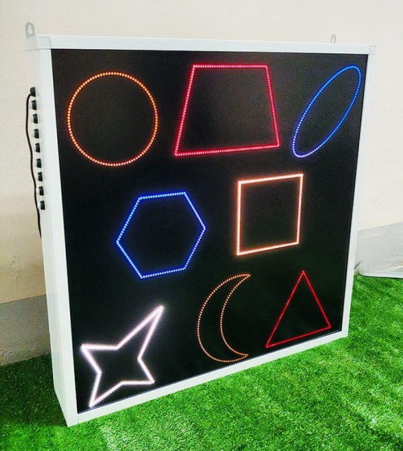 Панно с интерактивными светящимися фигурами - прекрасный способ развивать мышление и память у детей. Такая интерактивная игрушка понравится всем детям без исключения, так как имеет множество интересных светящихся деталей и кнопок. Данная панель имеет возможность устанавливаться на стену, что облегчает удобство использования и открывает много новых возможностей при использовании. На панели представлено восемь геометрических фигур, которые дети смогут включать и выключать независимо кнопками. С такой интерактивной панелью вы сможете придумать большое количество развивающих игр и занятий. Например, показывайте карточки с фигурами ребенку, а он должен будет нажимать на определенную кнопку на панели. Такой процесс отлично развивает не только память, но и логическое мышление. Если вы хотите подарить ребенку интересную игрушку, которая будет приносить много положительных эмоций и пользы, то обязательно рассмотрите этот вариант. Имеется возможность изготовления панно с разным количеством и типами фигур (оговаривается индивидуально с учетом пожеланий заказчика).