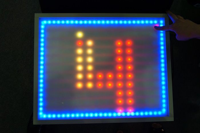 Размер 30х30х10см. При рисовании пальцами по панели повторяется рисунок движения, который гаснет не сразу, а с запозданием, образуя шлейф свечения.