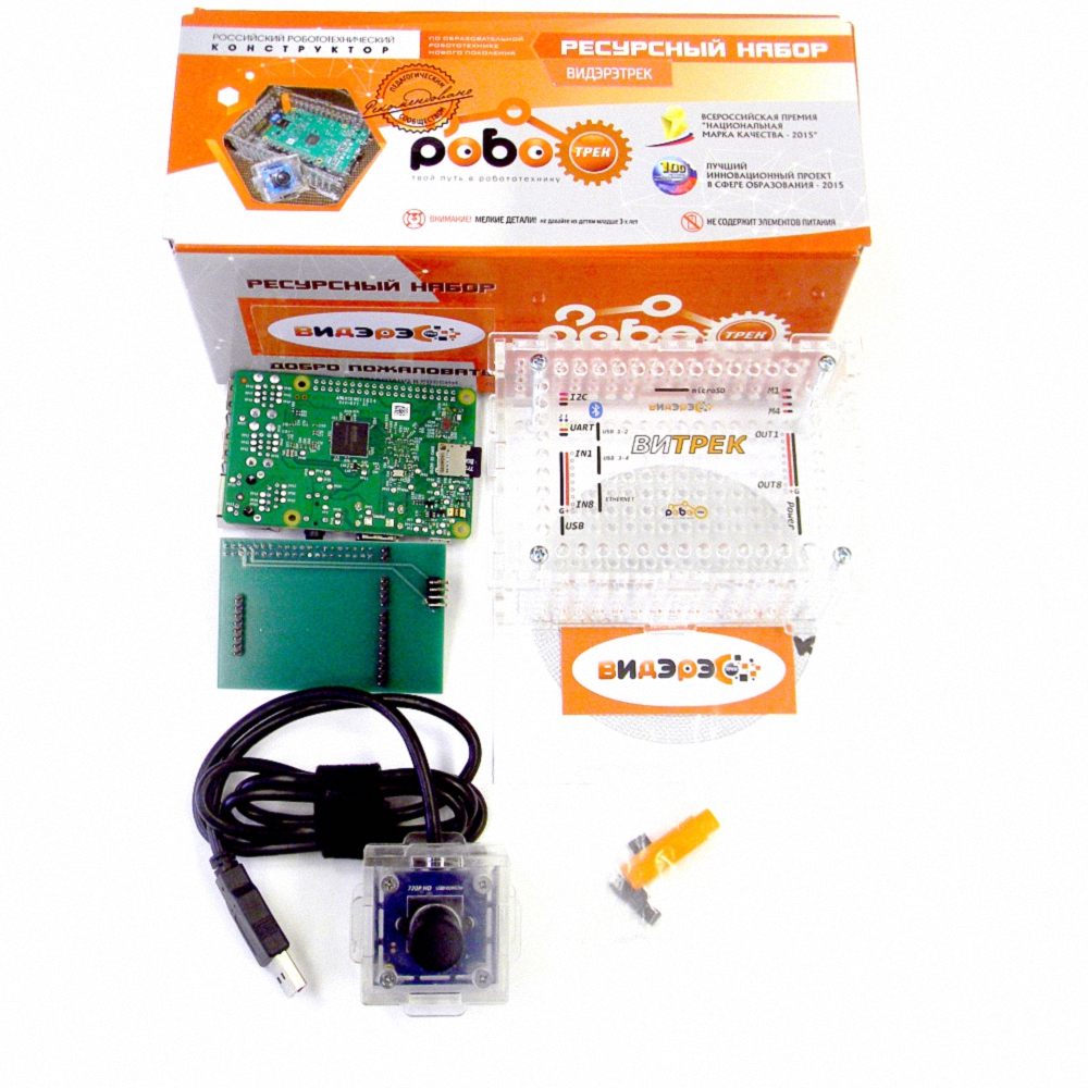 Ресурсный набор «Видэрэтрек 1» позволяет расширить возможности контроллера Трекдуино за счет надстраивания микрокомпьютера со специальной операционной системой. Данный набор при подключенной HD-видеокамерыпоможет решить задачи, связанные с: