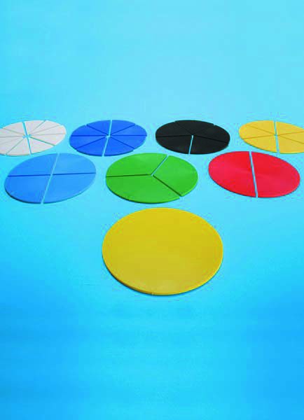 Набор кругов, разделенных на части. 8 разноцветных пластиковых кругов диаметром 10 см. Один круг целый, другие разбиты на сектора. Можно работать с дробями со знаменателем 2, 3, 4, 5, 8 и 10.