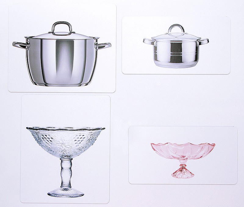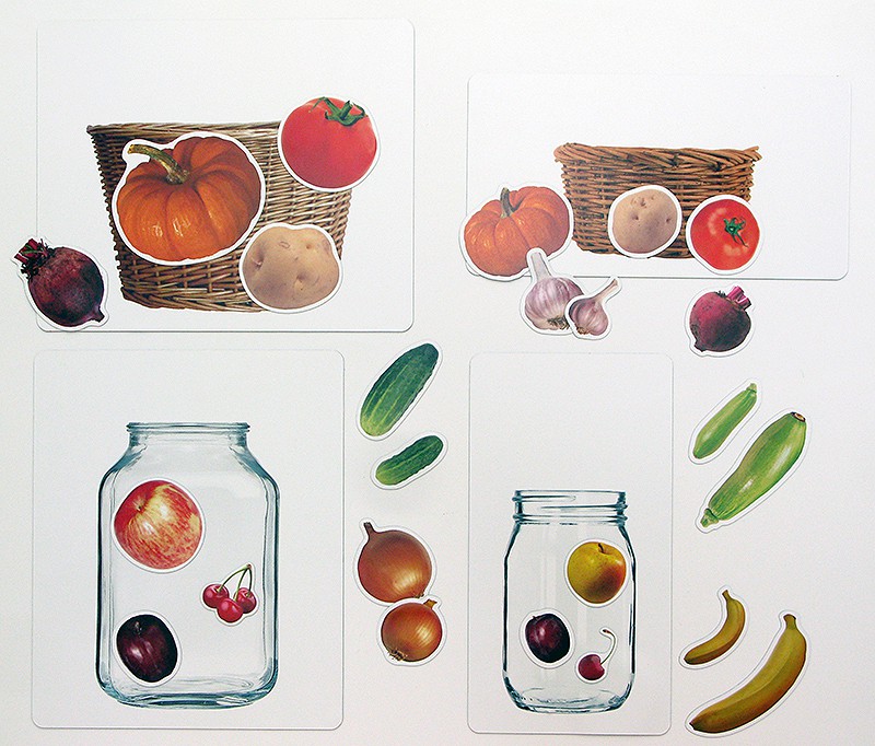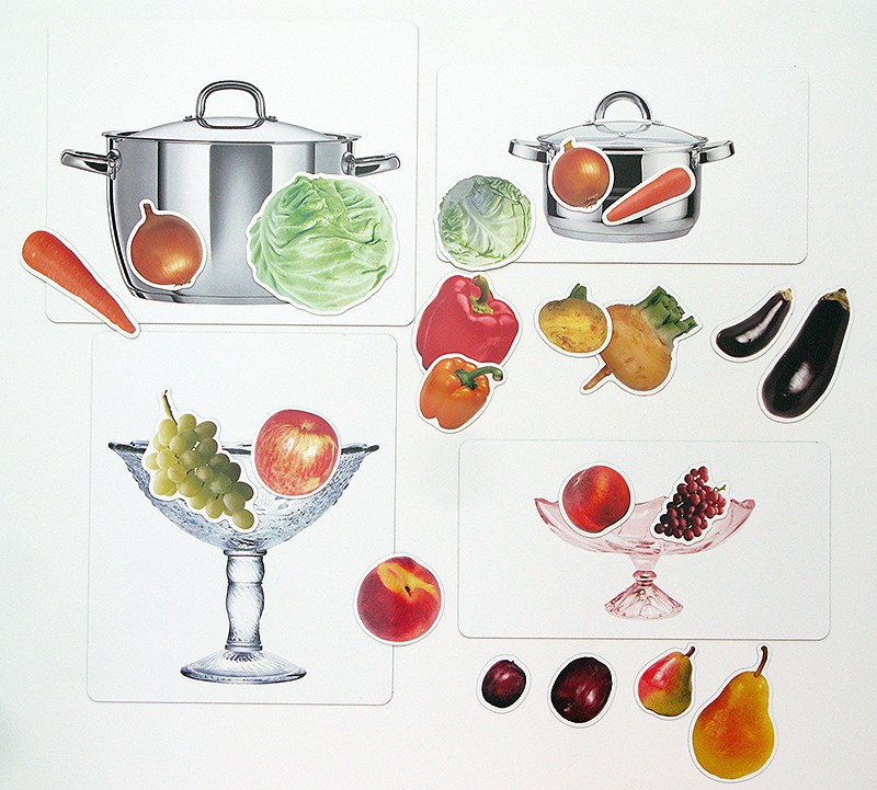 В состав изделия входят магнитные поля с изображением двух кастрюль (большой и маленькой), двух вазочек для фруктов, двух корзинок и двух банок. Эти магнитные поля прекрасно держатся на классных досках. К ним надежно притягиваются карточки с изображением овощей и фруктов (они также представлены в двух размерах). Их всего 48.