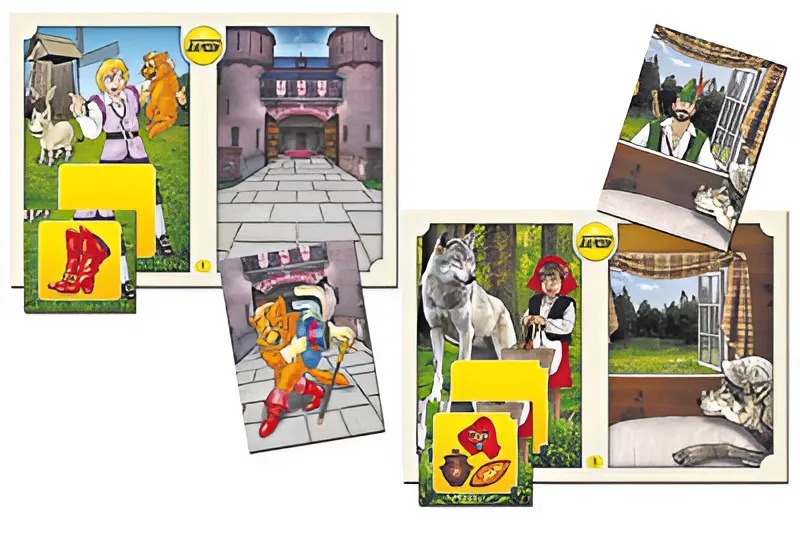 Игра состоит из 12 полноцветных игровых полей формата А5, 12 квадратных и 12 прямоугольных полноцветных карточек. Карточки и игровые поля изготовлены из картона и ламинированы пленкой. Каждое игровое поле посвящено одной из известных сказок. На карточках изображены персонажи и предметы, которые встречаются в этих сказках и оказывают значительное влияние на ход событий в них. Карточки служат продолжением изображений на игровых полях и содержат общие с ними детали фона.