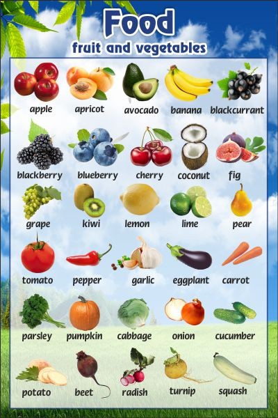 Раздел «Фрукты и овощи» - один из самых главных в теме «Еда» при изучении английского языка. Качественная и яркая наглядность поможет детям запомнить название самых распространённых в России и Англии овощей и фруктов. Черешня и кокос, лимон и бананы, тыква и свекла - ровно 30 наименований овощей и фруктов с яркими и сочными иллюстрациями к ним. С такой наглядностью детям будет учиться приятно и легко.