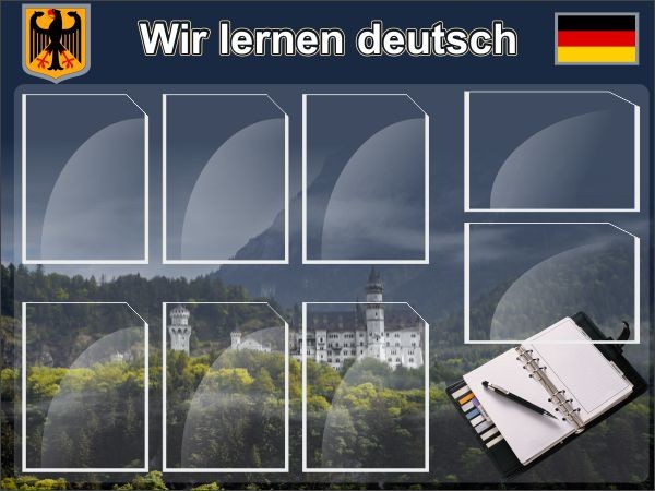 Прекрасный дизайн стенда и восемь кармашков А4 – убедительные причины, чтобы обратить внимание на такой интересный вариант, разнообразить кабинет немецкого языка. В карманы существует возможность складывать любую важную информацию и интересные сведения. Следует отметить, что все, кроме двух карманчиков, располагаются вертикально. Соответственно, оставшийся «дуэт», расположен горизонтально. Серьезный и строгий дизайн, тем не менее, не будет поводом, чтобы хоть кто-нибудь из учащихся заскучал. А о преподавателе, даже упоминать не стоит, в этом ключе. Каждого школьника можно подключить к процессу по заполнению карманов этого стенда.