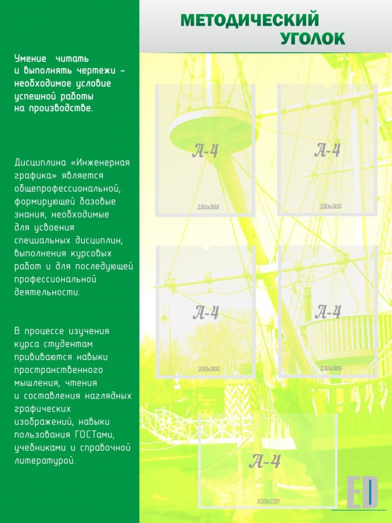 Такой стенд отлично подойдет не только для школы, но и для институтов с техническим уклоном. На нем размещены пять кармашков, формата А4, для размещения любой информации, которая может заинтересовать школьников или студентов. Стенд строг и аккуратен, без излишеств и отвлекающих деталей. Качество данного стенда на очень высоком уровне. ПВХ- пластик, пленка с фотопечатью, и ламинирующая пленка сделают стенд долгосрочным, сохранив его первоначальное состояние на долгое время. Краска не поблекнет и не потускнеет. А приятный фон будет радовать глаз учителю и ученикам. Он идеально впишется в любой класс.