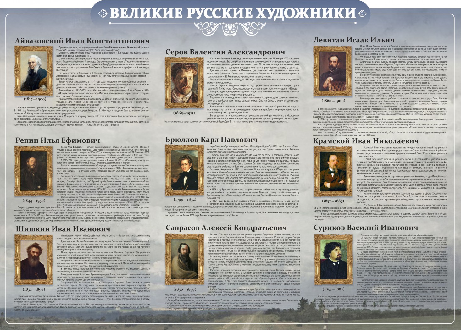 Главная Каталог Стенды Кабинеты ИЗО, Черчение и МХК Стенд "Великие русские художники"