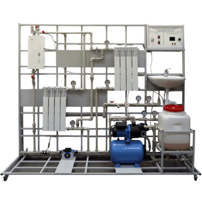 Стенд позволяет на практике изучить основные элементы системы водоснабжения и отопления, а также самостоятельно производить монтаж, сборку и наладку системы трубопроводов. Измерительные приборы, установленные по всей системе стенда, позволяют снимать показания температуры, давления, а также расхода для проведения лабораторных измерений.