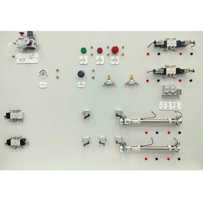 Учебный комплект электропневматических элементов для изучения структур и законов управления электропневматическими приводами.
