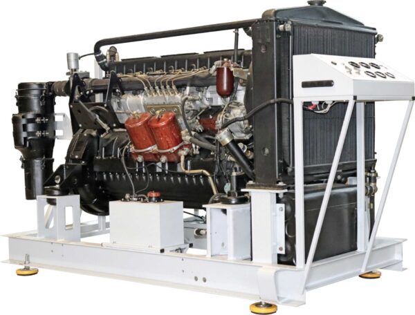 Лабораторный стенд выполнен в виде напольной стальной рамной конструкции и построен с использованием стандартной компонентной базы (поршневого дизельного двигателя, навесного оборудования, электрооборудования и элементов внешних систем) дизельного двигателя Д6. На стенде смонтирована система охлаждения двигателя с радиатором, система топливоподачи с топливным баком, система отвода отработанных газов с глушителем, система электрооборудования. На лицевой панели размещены основные штатные приборы индикации рабочих параметров двигателя (тахометр, индикаторы температуры охлаждающей жидкости и масла). Пуск двигателя обеспечивается при помощи выключателя стартера и приборов. Выбор режима работы двигателя при работе без нагрузки (в режиме «холостого хода») обеспечивается изменением частоты вращения коленчатого вала с панели управления стенда. Лицевые панели и панель управления стенда имеют защитное порошковое покрытие.